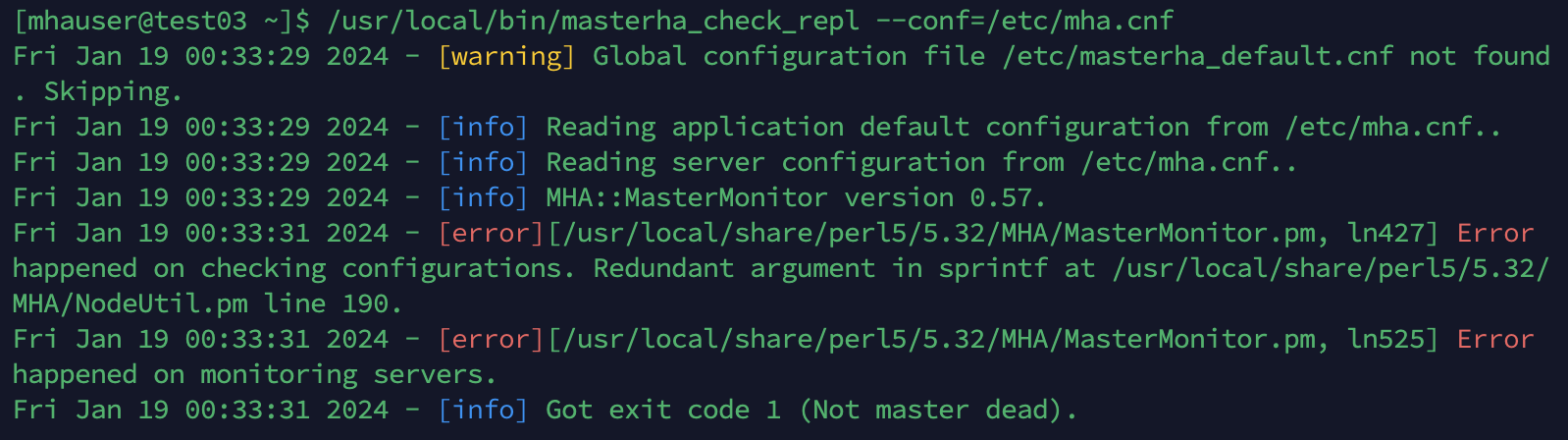 Tue Jan 16 22:36:07 2024 - [error][/usr/local/share/perl5/5.32/MHA/MasterMonitor.pm, ln427] Error happened on checking configurations. at /usr/local/bin/masterha_check_repl line 48.
